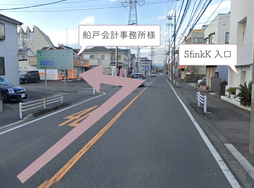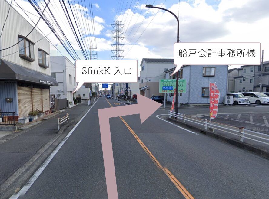 当店「SfinkK」を通り過ぎて「舟戸会計事務所様」を左折してください!